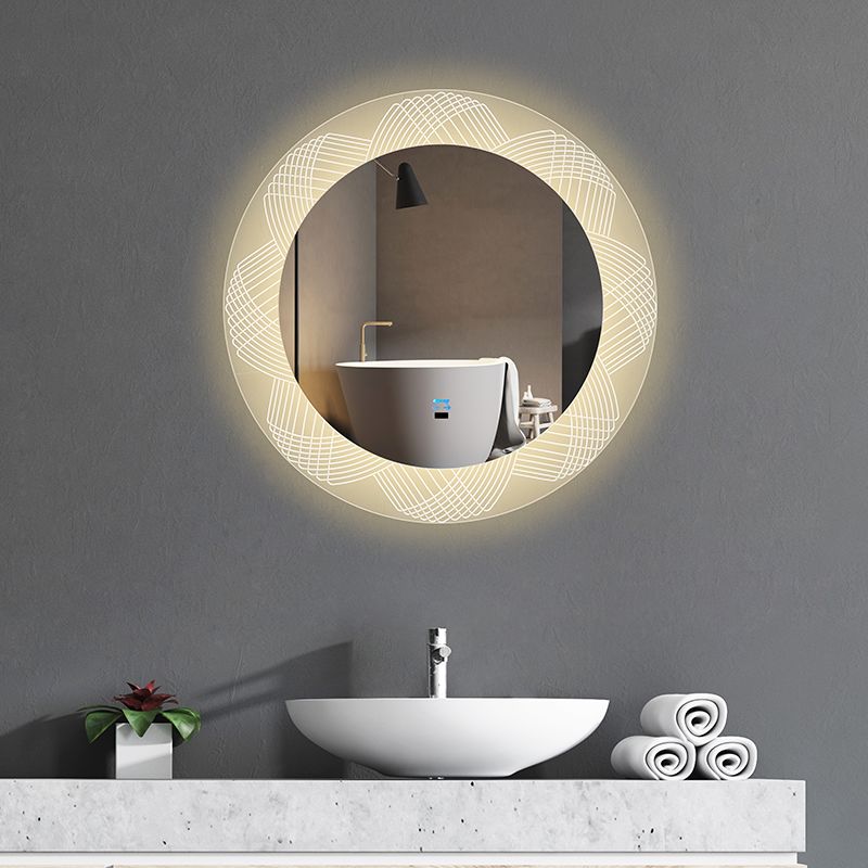 espelho de banheiroespelho de banheiro redondo inteligentedesign redondo clássico, com curvas suaves que adicionam um toque moderno e suave, evitando as bordas afiadas dos espelhos quadrados tradicionais. Ele complementa perfeitamente os estilos de banheiro contemporâneos, escandinavos ou minimalistas de luxo.Linhas decorativas exclusivas emolduram a borda do espelho